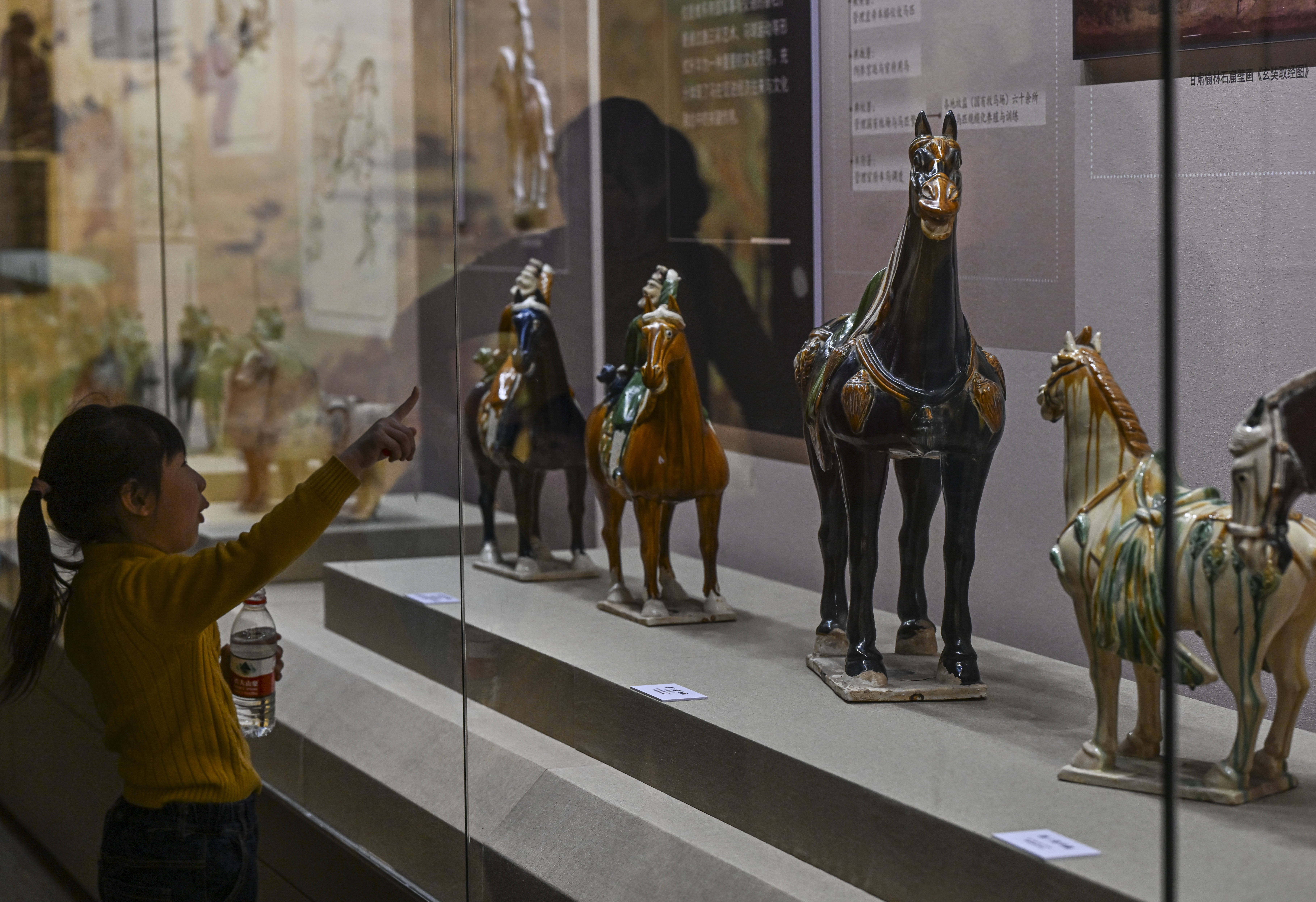 小朋友在乌鲁木齐市博物馆观看展出的唐三彩马展品(2026年2月11日摄)。新华社记者 王菲 摄