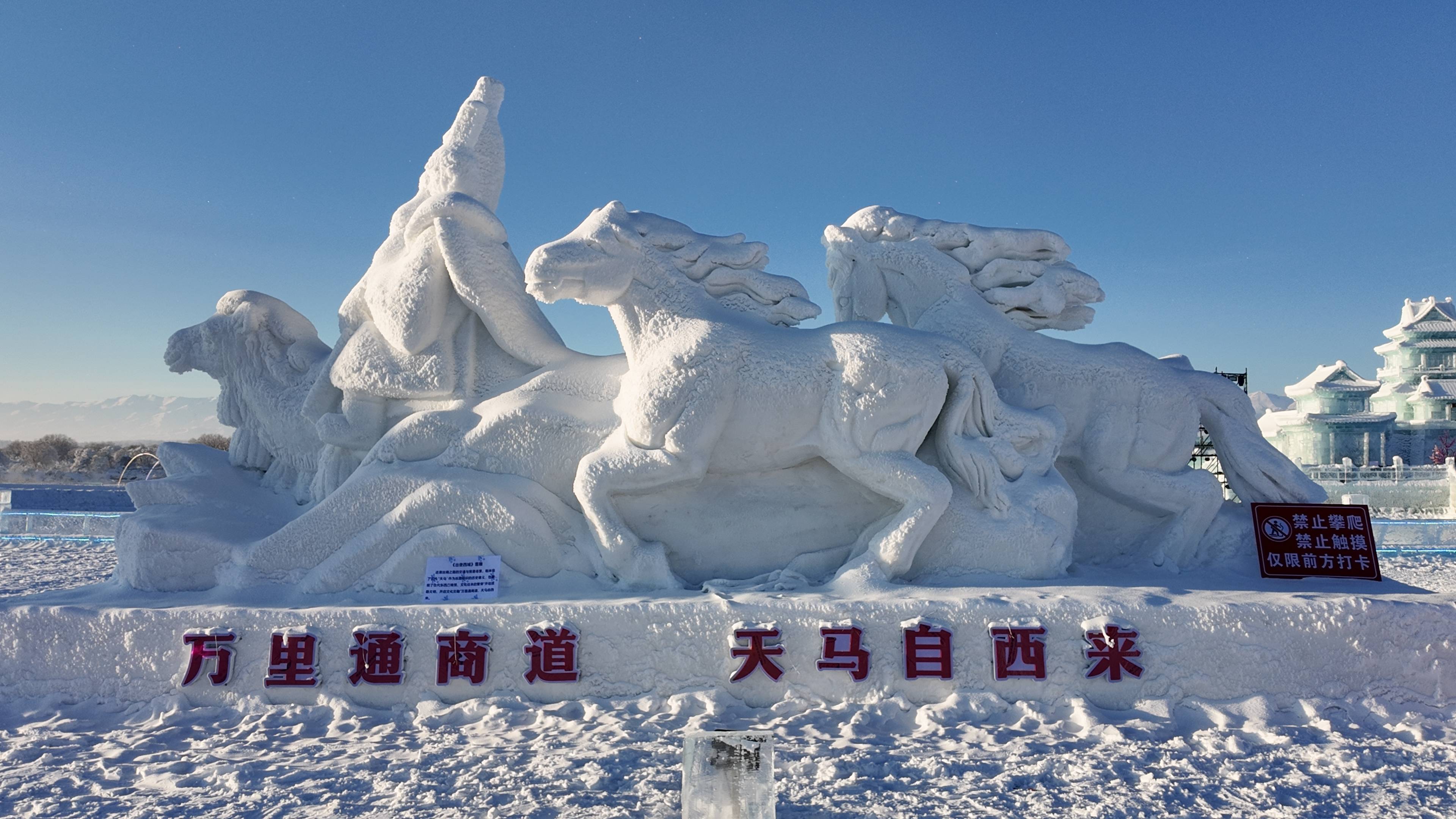 这是昭苏湿地公园景区“天山冰雪乐园”内的一组雪雕作品(2025年12月25日摄)。新华社记者 王泽宇 摄
