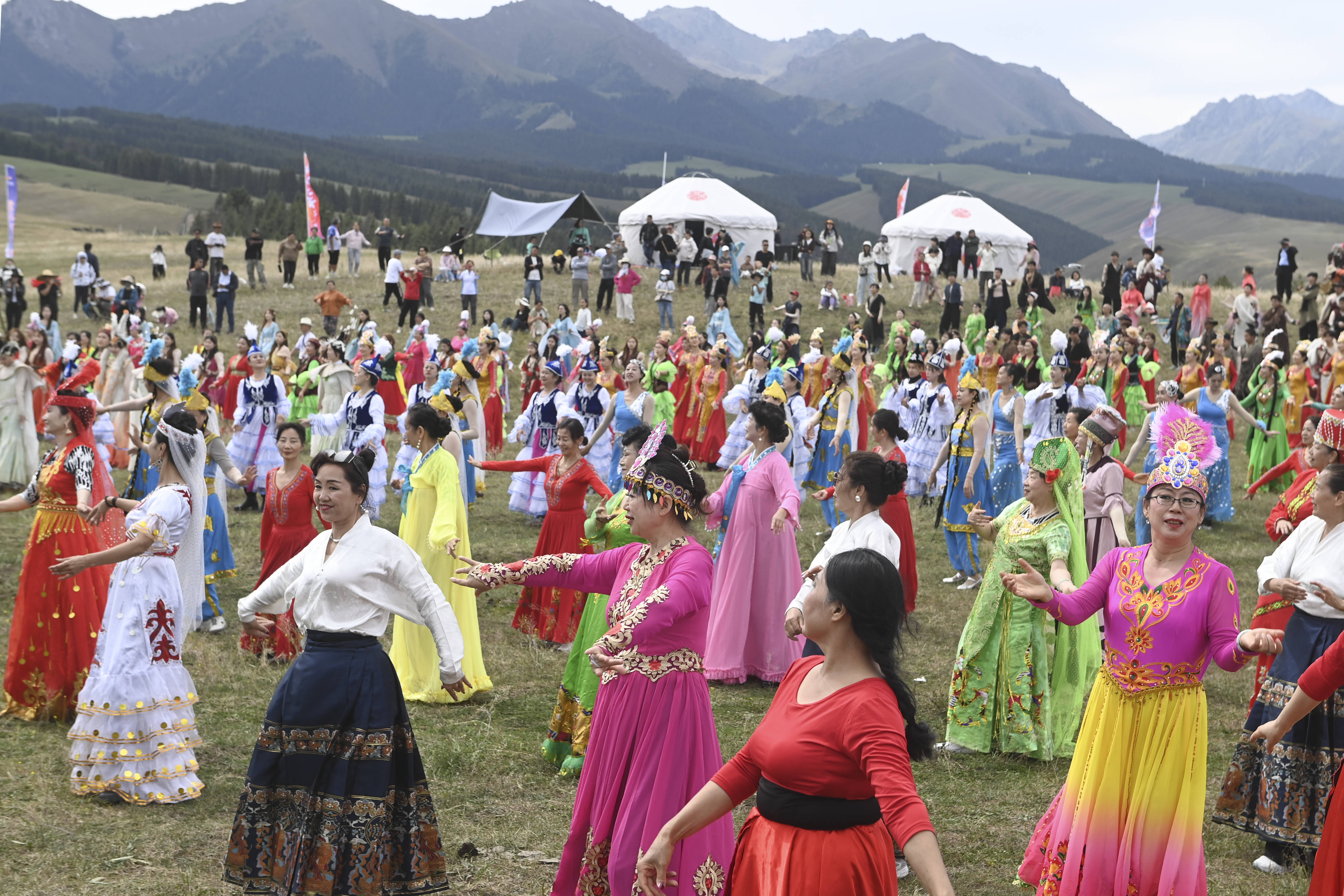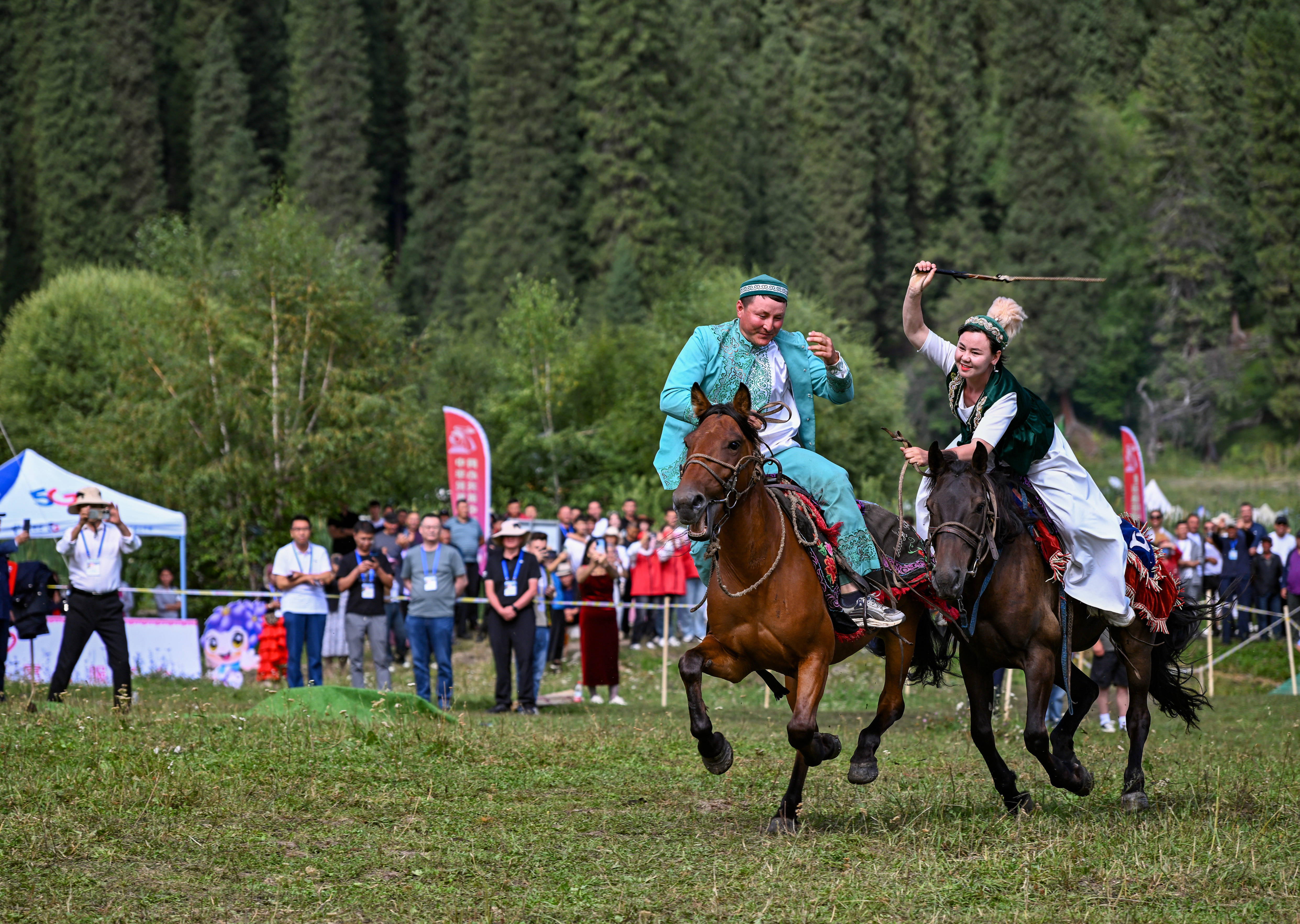 人们在新疆伊犁巩留县库尔德宁为游客展示“姑娘追”(2024年7月19日摄)。新华社记者 陈朔 摄