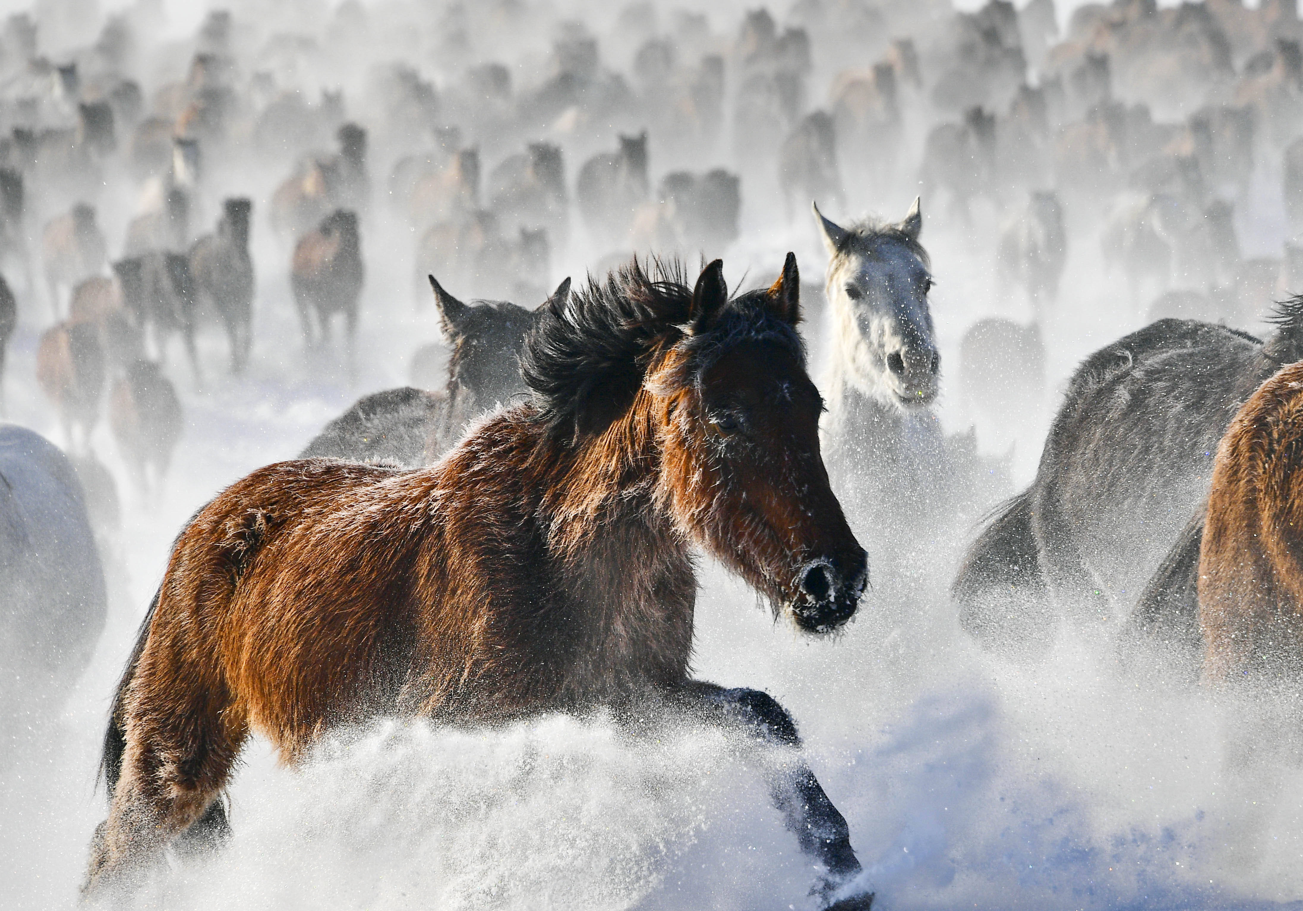 新疆昭苏县卡尔坎特草原,万马奔腾驰骋雪原(2021年12月20日摄)。新华社发(李文武 摄)