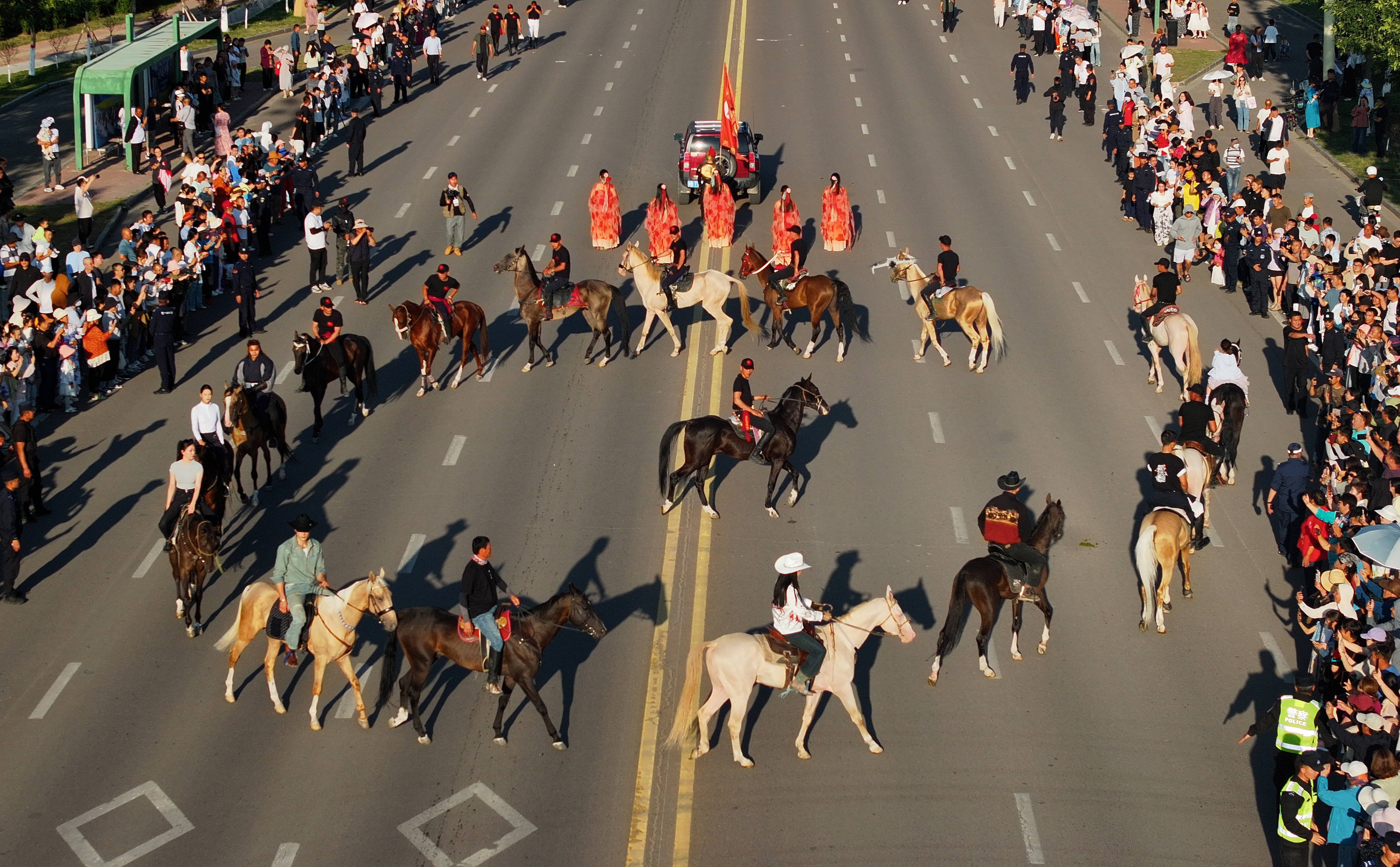在新疆昭苏县天马大道上,骑手骑着汗血马在巡游活动中表演(2025年7月18日摄)。新华社发(张利民 摄)最动人的万马奔腾