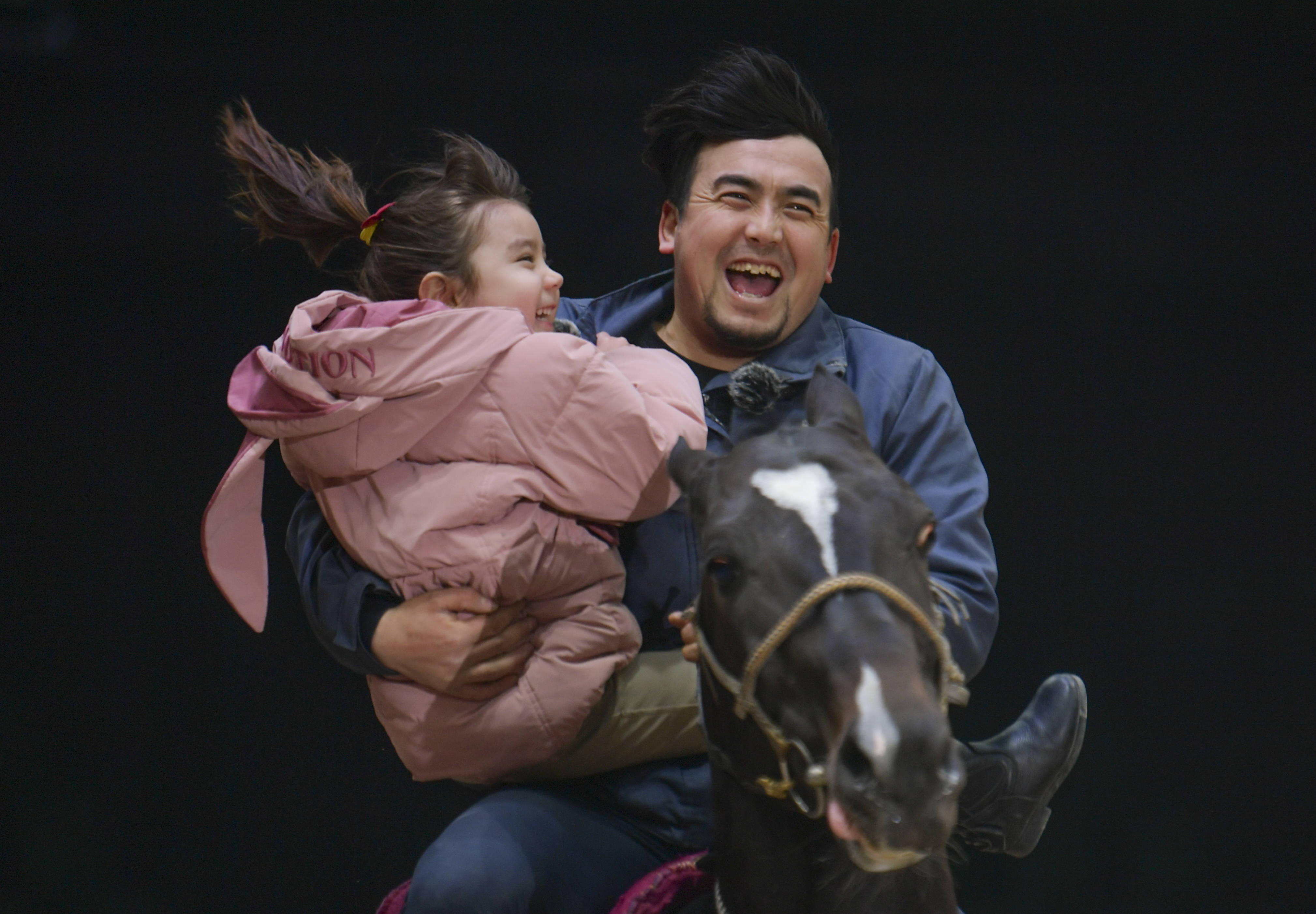 在乌鲁木齐汗血马基地,驯马师希尔扎提抱着女儿一起骑马(2024年3月7日摄)。新华社记者 王菲 摄