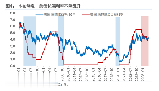 从资产表现看,本轮美联储降息周期内,10年期美债利率不降反升。自2024年9月降息启动以来,由3.73%上行至2026年2月13日的4.04%,累计上行31BP。财通证券指出,这与2001年、2007年、2019年三轮降息周期中长端利率显著下行的规律截然相反,反映市场对美元资产信心渐失,美债需向投资者提供更高信用溢价。